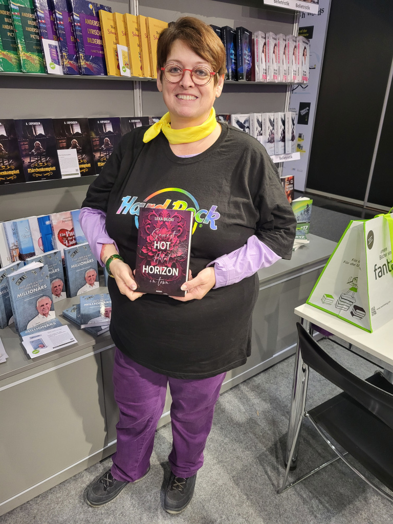 Person mit Brille hält ein Buch mit dem Titel Hot Horizon vor einem Bücherregal